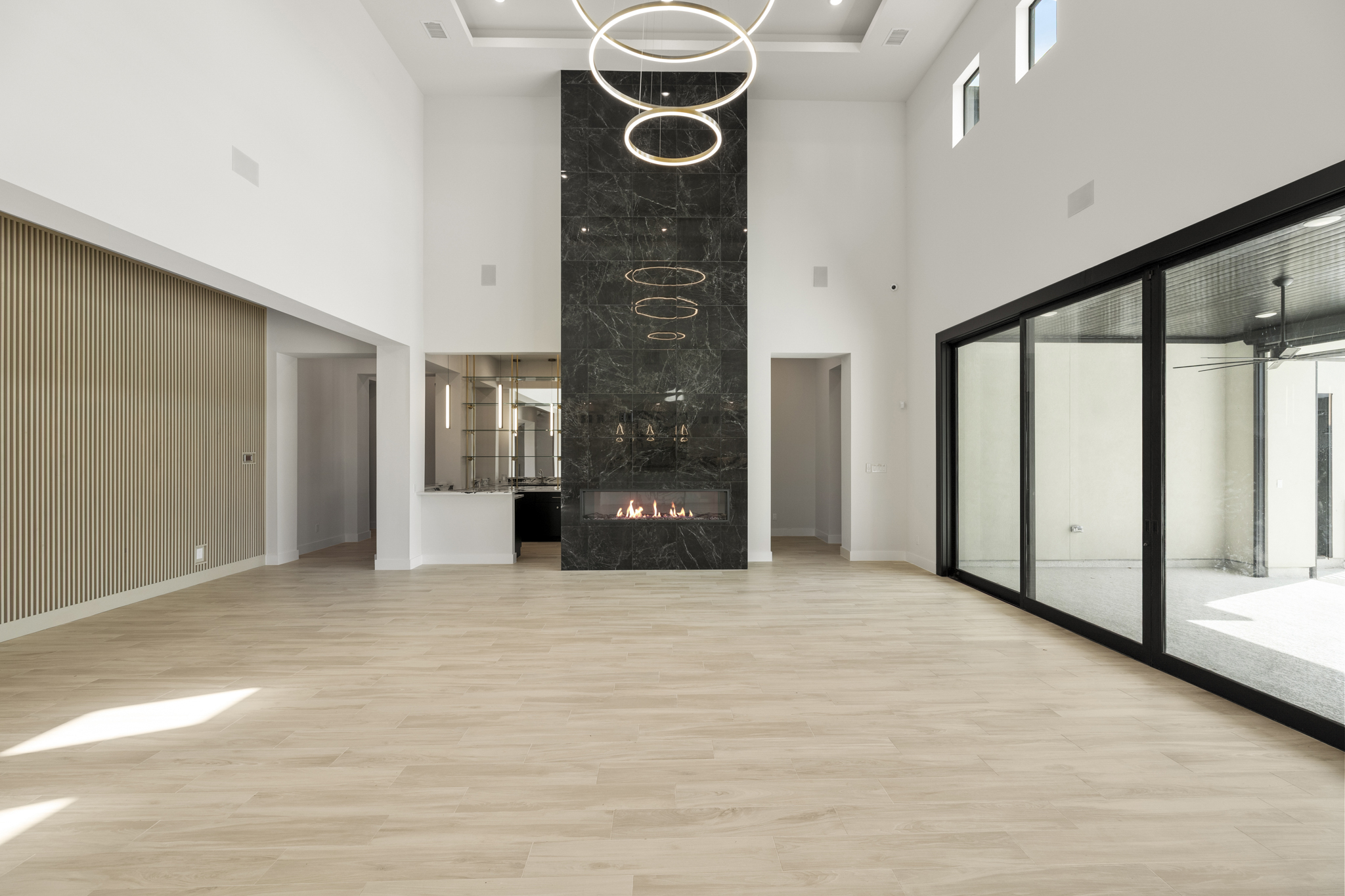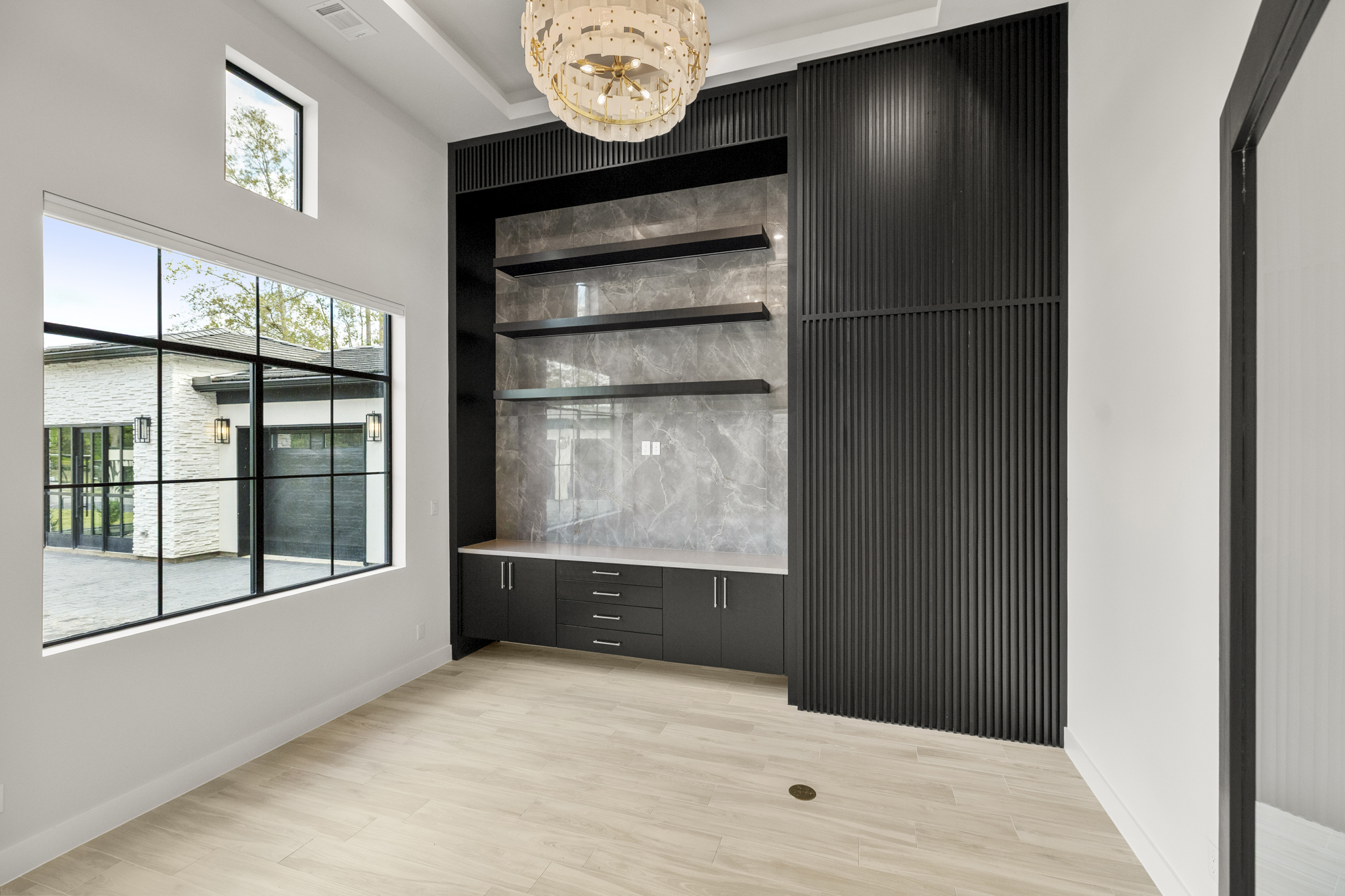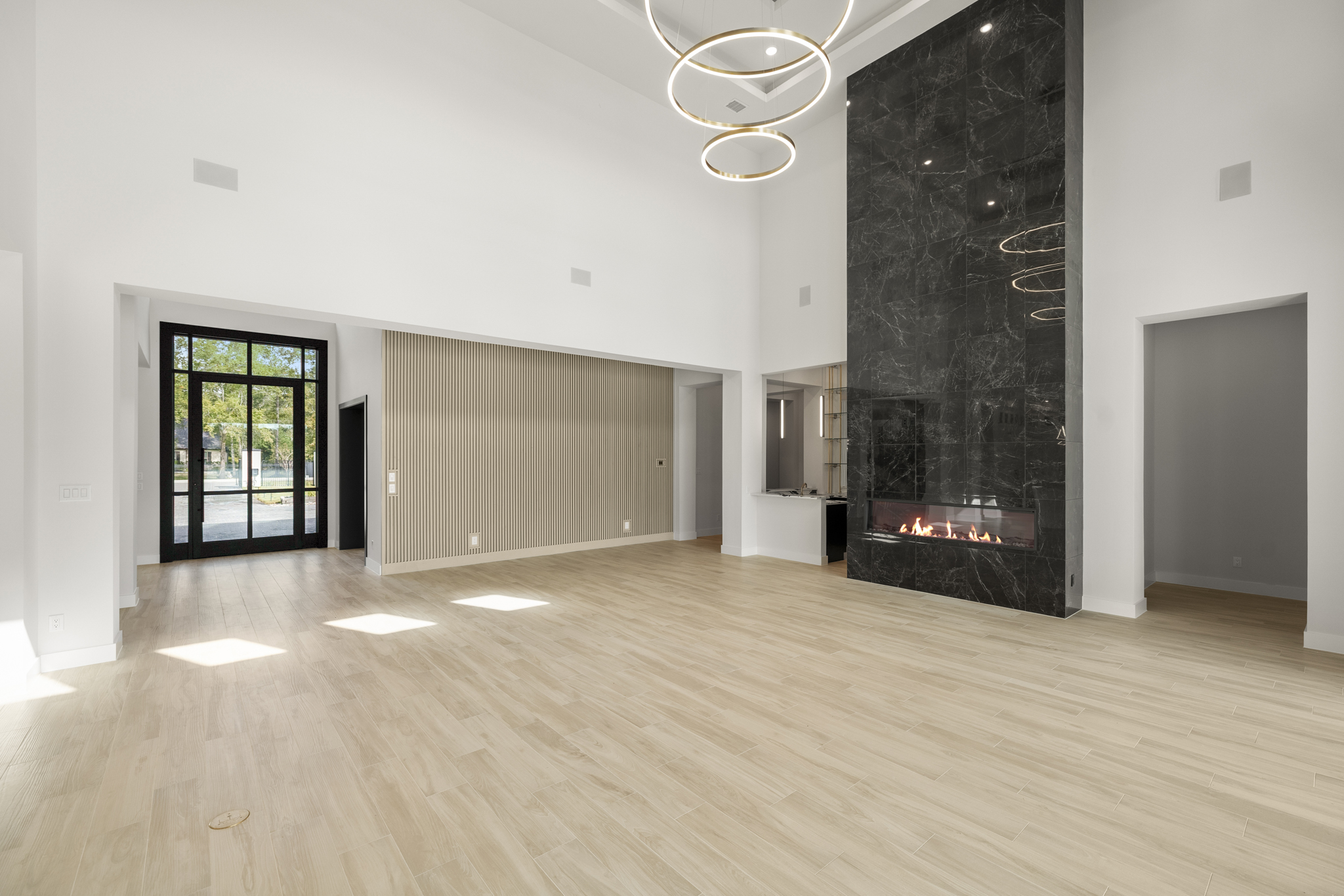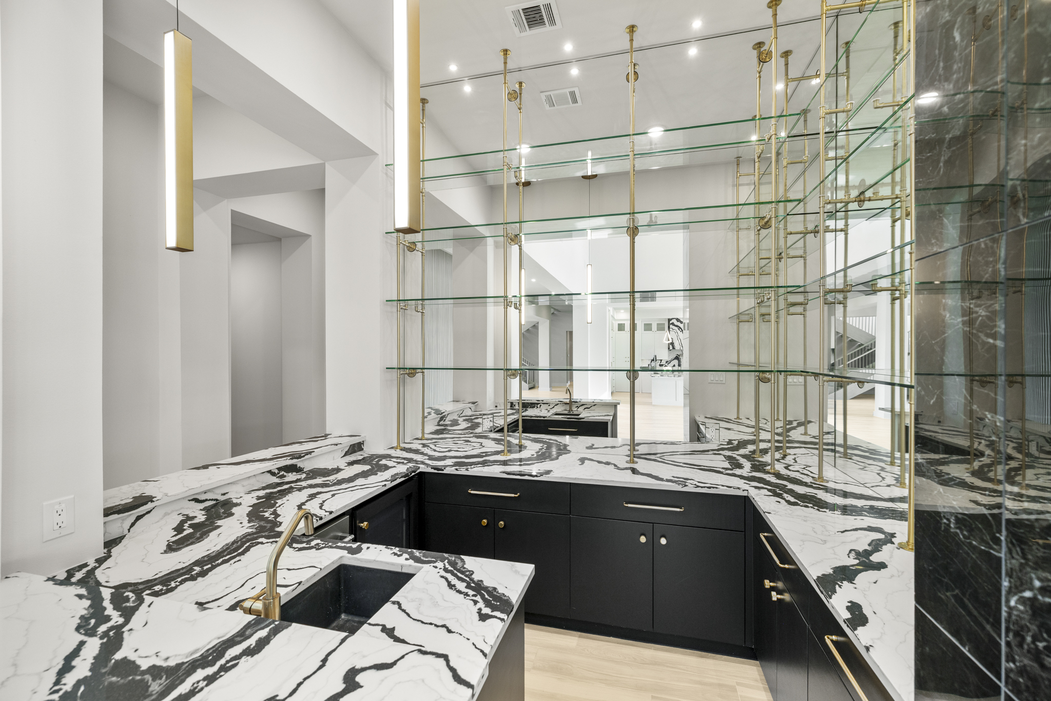 This custom masterpiece was built for none other than Simone Biles and Jonathan Owens — a home that blends bold design with everyday livability. From the striking black-and-white marble throughout the kitchen and bar to the sleek fireplace wall anchoring the soaring living space, every detail was made to match their style, energy, and lifestyle.